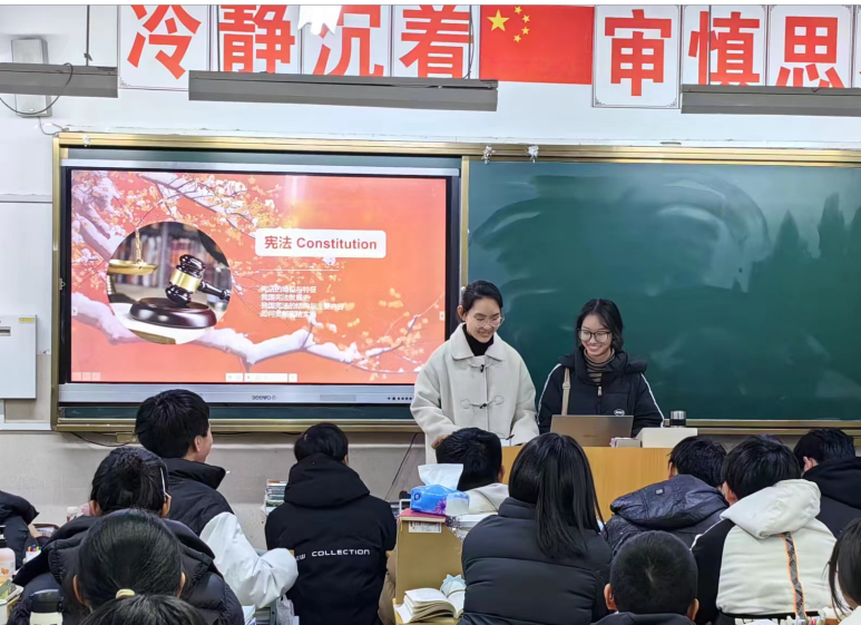 在活动开始之前,队伍成员王燕琦首先与母校老师沟通普法宣传的时间地点等,学校领导和老师高度重视,积极配合,经讨论,最终确立高一年级一班为普法地点。在确立地点后,队伍成员们分工协作,商量活动细节,力求整个活动的流畅性和真实性。活动以宪法为主题,部分队员有针对性的查找关于宪法的相关资料、真实案例等以保证活动内容的权威性与准确性,另一部分队员撰写稿子并且制作了相关的PPT。同时为了调动同学们的主动性,积极参与活动,牢记普法内容,达到更好的效果,队伍设计了问答环节和宪法标语的征集,还准备了小奖品发放。队员们经老师介绍,在同学们热烈的掌声中,开始了普法宣传。这次宣传从宪法的地位特征、我国宪法发展史、如何贯彻宪法实施三个方面进行。为了同学们切实理解、灵活运用,队员把重点放在如何贯彻宪法的实施,并结合了同学们目前所学的书本知识和实际生活。在问答环节,同学们踊跃发言,积极回答问题,并收到了小奖品,现场氛围活跃。队员们抛砖引玉,在现场进行了宪法标语的征集,取得了良好的效果。在活动结束后,队员们评选了最美标语为法润人心,德润天下。除此之外,队员们还进行了反思与总结,反思不足之处,总结实践经验。