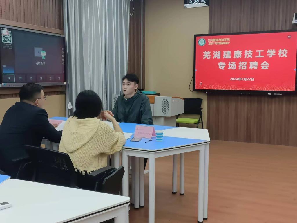 2024届毕业生积极向用人单位投递简历。芜湖医药卫生学校、芜湖建康技工学校的负责人向同学们介绍了两所学校的发展历程、岗位需求、职业发展、培养体系、晋升制度及薪酬待遇等情况,并对应聘同学分组进行面试。据反馈,两家用人单位在初筛的基础上共接收海豚直播