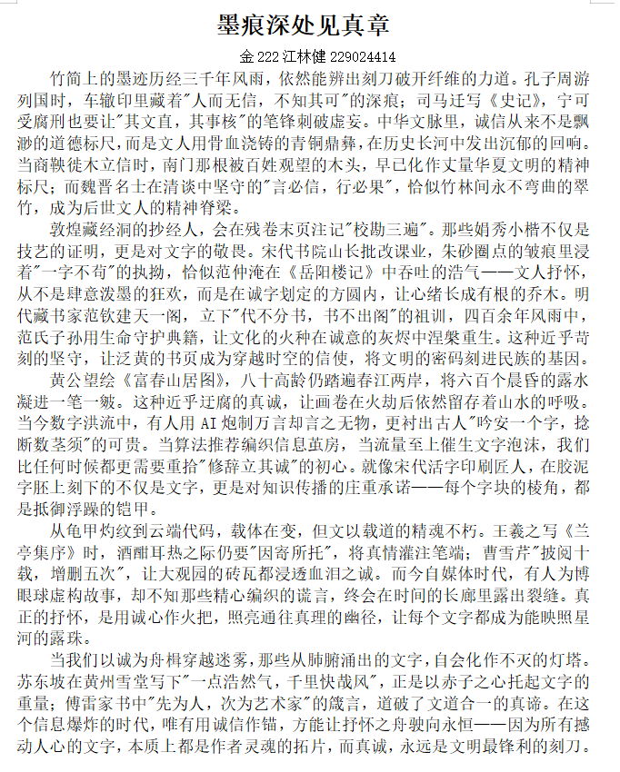 本次活动以“诚信”为核心主题,鼓励学生通过文学创作的形式,探讨诚信的价值与意义,抒发个人对诚信的感悟与思考。活动旨在通过文字的力量,深化学生对诚信的理解,倡导诚实守信的道德风尚,传承和弘扬中华优秀传统文化。“诚信不仅是个人立身之本,更是社会和谐发展的基石”。活动过程中,同学们饱含热情,以文字展现青年风采,传承诚信精神。将现实中的案例融入创作,真正做到学以致用并且领悟出诚信在个人成长、社会交往及职业发展中的重要作用。评委们以分组的形式进行评选工作,秉持公平公正的原则,评选出了数篇优秀征文。其中,会232杨浩、金222江林健、政241张莹的文章脱颖而出,参赛者用他们自己的笔触,展示了诚信的重要性以及现实生活中诚信与人们的紧密联系。