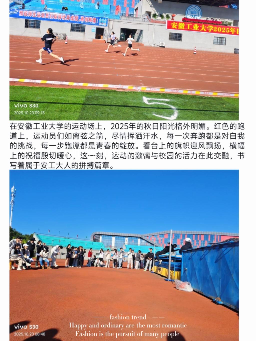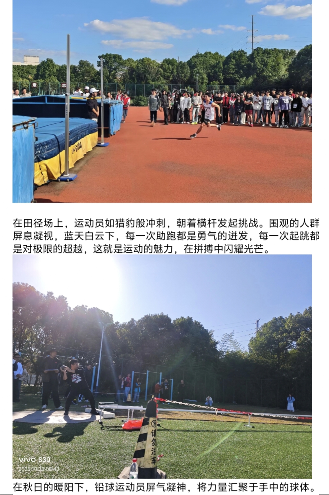 运动员在赛场上的飒飒英姿,并配字上传至活动群中。同学们热情投入活动,在为赛场健儿助威喝彩的同时,以镜头定格无数动人画面——有胜利时的相拥,也有失利后的搀扶;有专注的神情,也有挥洒的汗水。每一张照片背后,是观察、是理解、也是共鸣。通过真诚的影像记录与文字诠释,他们不仅留存了赛事的精彩,更凝聚了集体的温度,让团结、拼搏与友爱的精神在光影中永恒闪耀,充分展现了当代青年善于发现、勇于表达、乐于共享的崭新风貌。