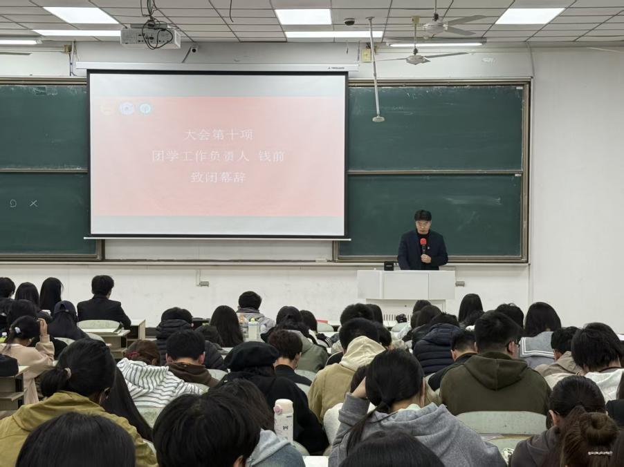 钱前发表闭幕词宣告本次大会圆满结束,对大会的成功举办表示祝贺,并对所有参与者的辛勤付出给予高度肯定,并希望新一届学生组织成员牢固树立为青年服务意识,认真履职,秉持朝气蓬勃、锐意进取的担当精神,团结并引领全院青年学子以青春之志汇入实现中华民族伟大复兴中国梦的壮阔实践,脚踏实地、奋勇争先,不惧艰难、勇往直前,为学校发展与海豚直播