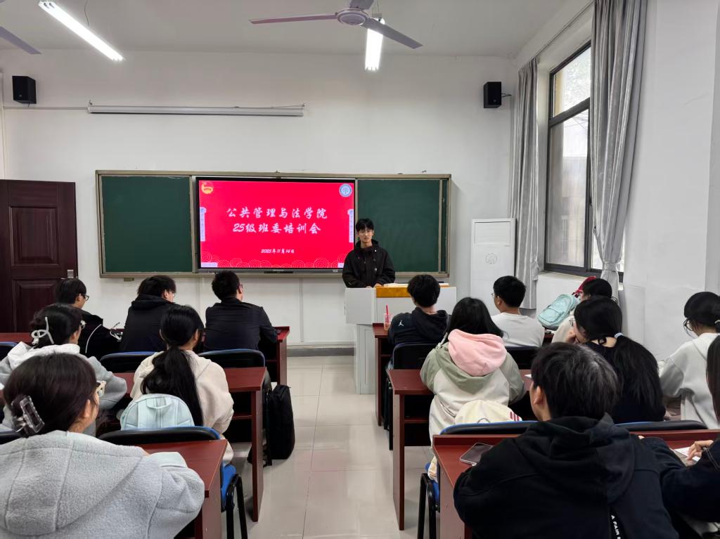 主席团在公法楼110教室开展2025级新生班委培训会。院学生会主席团成员余天阳、24级班长杜森、崔紫怡、团支书李璐璐、25级各班班长、团支书及学习委员参会。