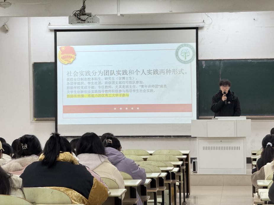 余天阳向同学们介绍了寒假社会实践的主题、报名方式以及其他相关要求,着重强调了寒假社会实践注意事项,并以实际事例向同学们展示了实践形式与内容,让同学们对如何开展社会实践有了更加深入的了解。