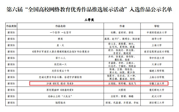 3月23日,教育部公布第六届“全国大学生网络文化节”获奖作品名单,我校选送的新媒体作品《初见感动传承》(指导教师:王菁、赵一,获奖学生:汪雨航、恽郑曦、张龙飞)获全国高校网络教育优秀作品三等奖。