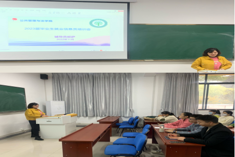 2023届毕业生就业信息员工作培训会在公法楼110教室开展。由各专业学生党员、已成功就业的学生代表、班长、团支部书记组成的全体就业信息员参加培训会。本次培训会由辅导员妮萨老师主讲。