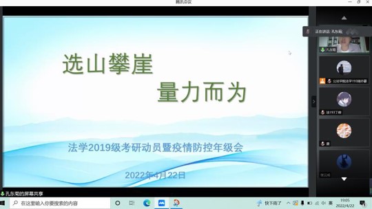 组织召开“线上教学阶段性总结、考研动员暨疫情防控”专题年级会议。会议由副院长孔东菊主持,本科2019级全体学生和辅导员参会。