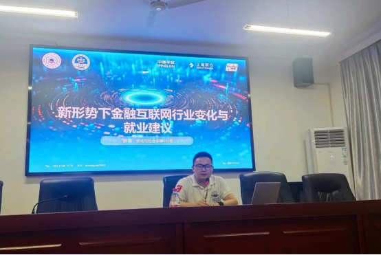 与社会保障专业,目前就职于中国银联,担任云闪付市场支持团队总监。讲座中,他用个人多年从事金融领域的实际经历,剖析了目前金融互联网领域的深刻变化,与同学们分享了金融互联网行业的发展方向、职业建议,建议同学们在就业时应准确评估自我价值,目光长远,在未来的工作中应该保持自己的高职业素养,脚踏实地面对每一件事。