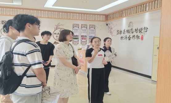 紧接着,调研团队来到桃花村,与村庄负责相关工作的干部进行了访谈,听取其对于桃花村两大支柱产业建设以及农户参与情况的介绍,并参观该村展示馆、史志园地与农产品电商直播间等地。然后,同学们在老师的指导下分成三个小组,入户开展访谈和填写调查问卷,从多维嵌入角度与村中农户进行了深入交流。同时,调研团队了解农村实际土地承包经营状况以及农民专业合作社等新型农业经营主体发展情况、深入交流当前发展面临的困境,探讨可能的解决路径等。