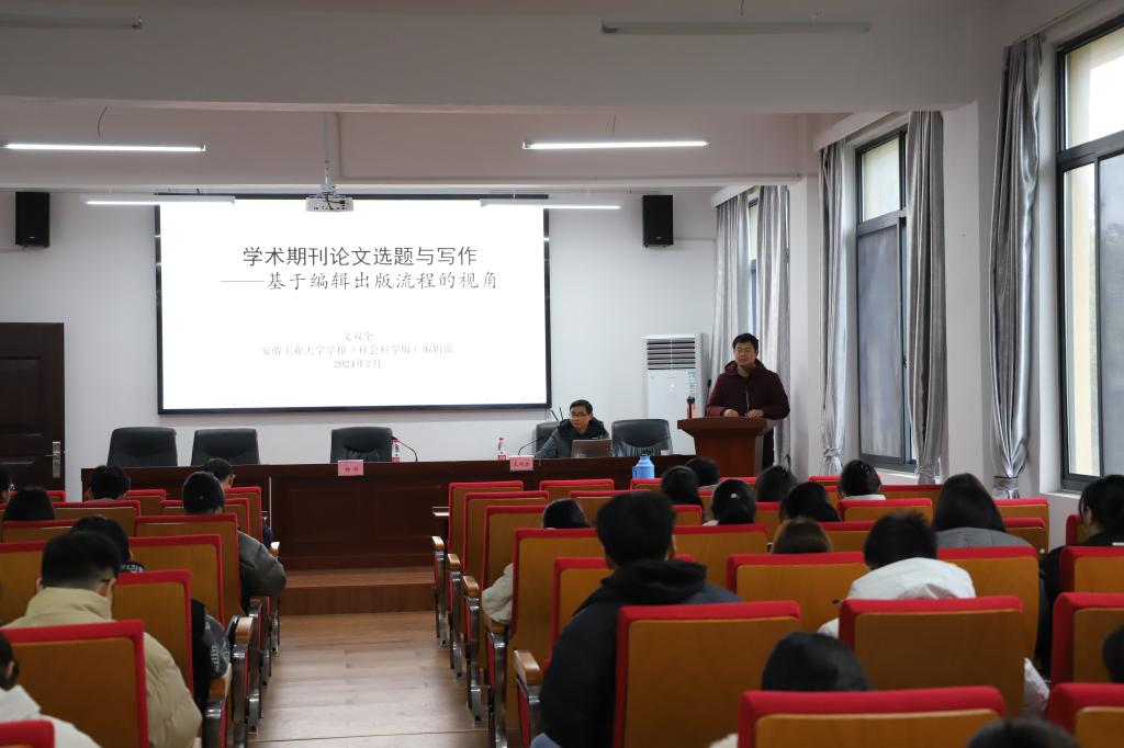 一流专业建设和“新文科”创新人才培养,提升学生论文写作能力与发表成功率。3月4日,邀请安徽工业大学学报(社会科学版)编辑部文双全老师主讲《学术期刊论文选题与写作——基于编辑出版流程的视角》,讲座由副院长杨哲主持,一百余位研究生、本科生以及部分老师聆听了讲座。