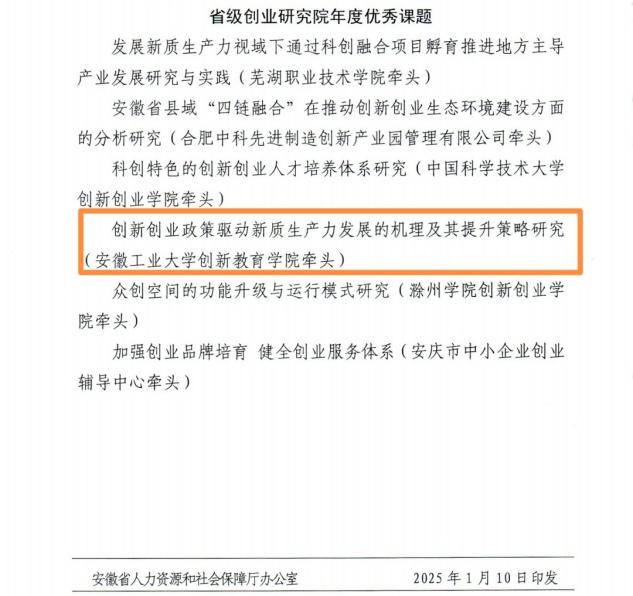 2025年1月10日,安徽省人力资源和社会保障厅、省教育厅、省财政厅联合印发了《关于印发省级创业研究院2024年度评估结果的通知》。劳动与社会保障系张增国、宫仁贵、汪伟和艾东研究团队承担的课题《创新创业政策驱动新质生产力发展的机理及其提升策略研究》荣获“优秀”课题称号。课题围绕创新创业政策对新质生产力发展的影响进行了深入探讨,提出了具有实践价值的提升策略,为推动安徽省经济社会发展提供了有力支持。