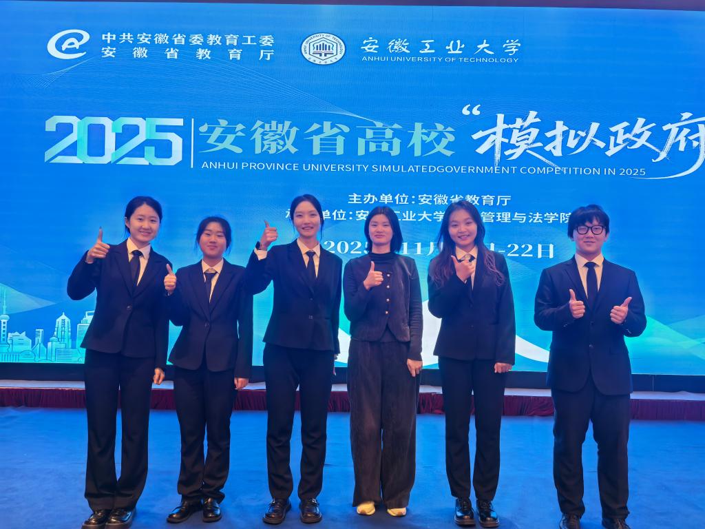 近日,由安徽省教育厅主办的2025年安徽省高校“模拟政府”大赛决赛圆满落幕。安徽工业大学派出的两支代表队凭借扎实的专业功底和出色的现场表现斩获佳绩。其中,由龙长安、施磊磊老师指导,胡祥宇、刘玉、张贝儿、李恬悦、刘文燕同学组成的“臻于至善”队,其参赛作品《智能技术赋能政务服务协同治理:市域社会治理现代化的路径研究——以M市12345热线平台为例》荣获大赛一等奖。由吴丽丽、焦芳芳老师指导,杨可雯、刘甜甜、赵默然、张馨心、魏俊杰同学组成的“致知力行”队,以作品《从“群众跑腿”到“数据跑路”:M市无证明城市赋能市域社会治理现代化研究》荣获大赛二等奖。
