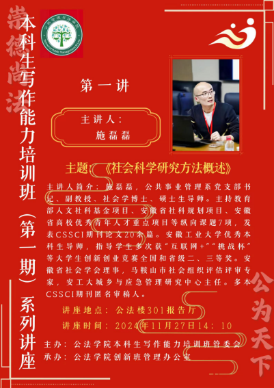 2.主讲人简介:施磊磊,公共事业管理系党支部书记、副教授、社会学博士、硕士生导师。主持教育部人文社科基金项目、安徽省社科规划项目、安徽省高校优秀青年人才重点项目等纵向课题7项,发表CSSCI期刊论文20余篇。安徽工业大学优秀本科生导师,指导学生多次获“互联网+”、“挑战杯”等大学生创新创业竞赛全国和省级二、三等奖。安徽省社会学会理事,马鞍山市社会组织评估评审专家,安工大城乡发展与应急管理研究中心主任。多本CSSCI期刊匿名审稿人。