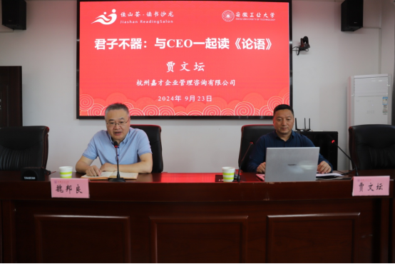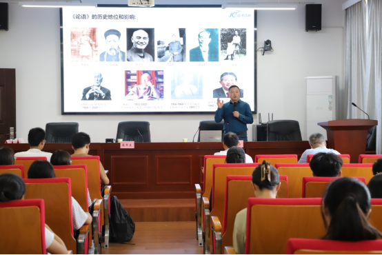 贾文坛介绍了《论语》的思想内容、成书过程以及后世影响。他说,《论语》主要以语录和对话文体的形式记录了孔子及其弟子的言行,集中体现了孔子的政治、审美、道德伦理和功利等价值思想。贾文坛结合人力资源管理具体案例,解释了“君子不器”“博我以文”“约我以礼”“士不可以不弘毅”“博学而笃志”“切问而近思”“为人谋而不忠乎”“与朋友交而不信乎”“君子三畏”“知和而和”“中庸之为德也”等《论语》所倡导的古代人才观以及它们与现代企业人才标准的内在契合和文化关联。贾文坛基于企业CEO的人才视角,激励同学们常怀质朴之心、多读经典著作、提升认知水平、砥砺心性品格;呼吁同学们树立正确的价值观,不仅要学好专业知识、做到通专结合,还要注重培养文化自信、增强社会责任感。